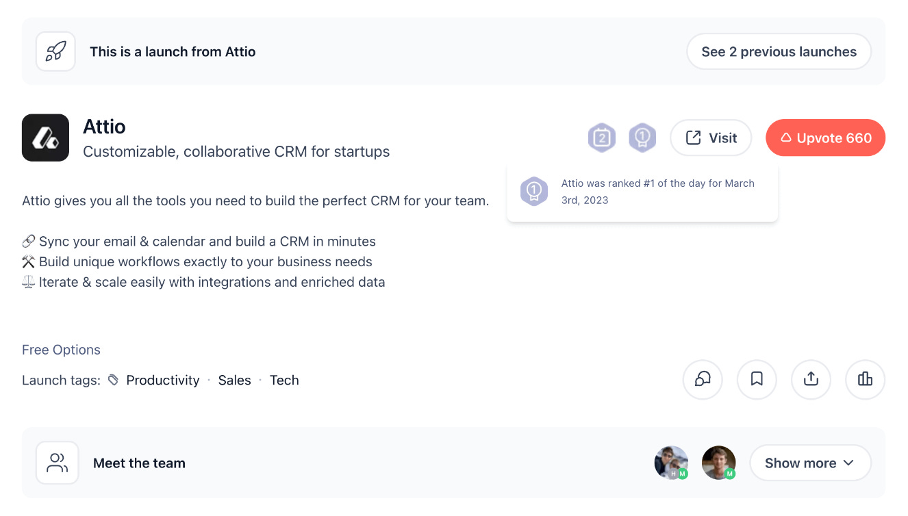 Product Hunt as launchpad. Attio hit #1 on launch day. For a tool targeting builders and operators, Product Hunt delivered the right audience at the right moment - early adopters tracking innovation, ready to try a new CRM on the spot.