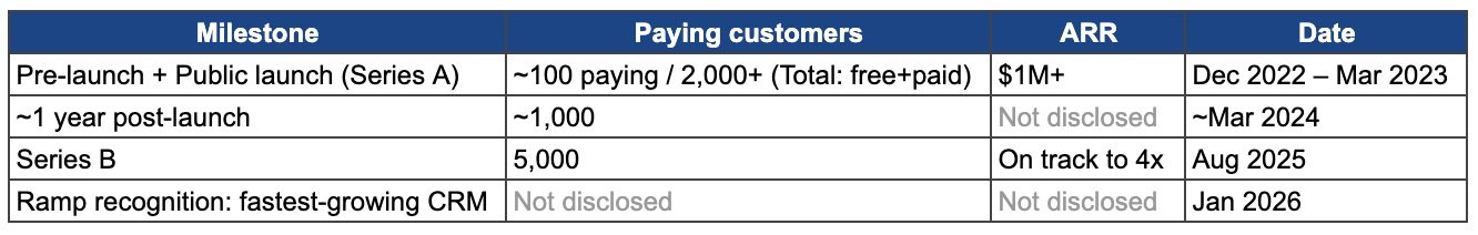 Attio crossed $1M ARR in December 2022 with ~100 paying companies - still in private beta. Three months later, the public launch paired with a Series A announcement revealed the full scale: 2,000+ customers across 100+ countries, most on free or trial tiers.
