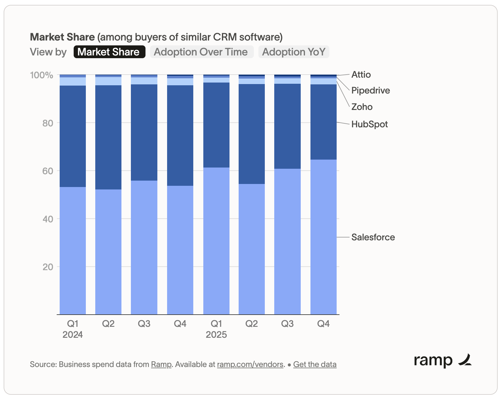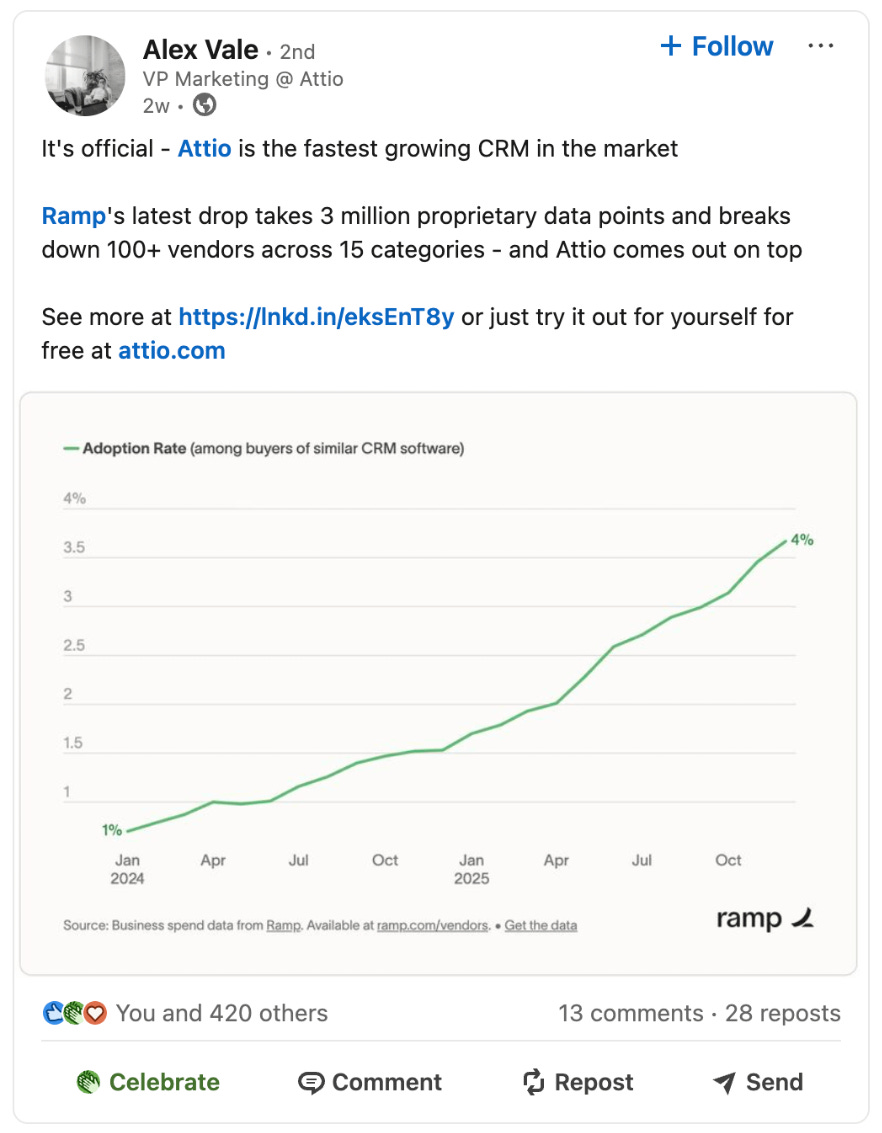Within two years of public launch, Attio captured ~4% adoption among CRM users and reached #5 in the category - behind Salesforce, HubSpot, Pipedrive, and Zoho. Confirmed by Ramp’s January 2026 vendor analysis across 3 million data points. Strongest traction is in micro-SMB (6% adoption), tapering to ~1% in mid-market and enterprise. The trajectory - from zero market presence to top five in 24 months - is the result of great software and years of building credibility before going public.